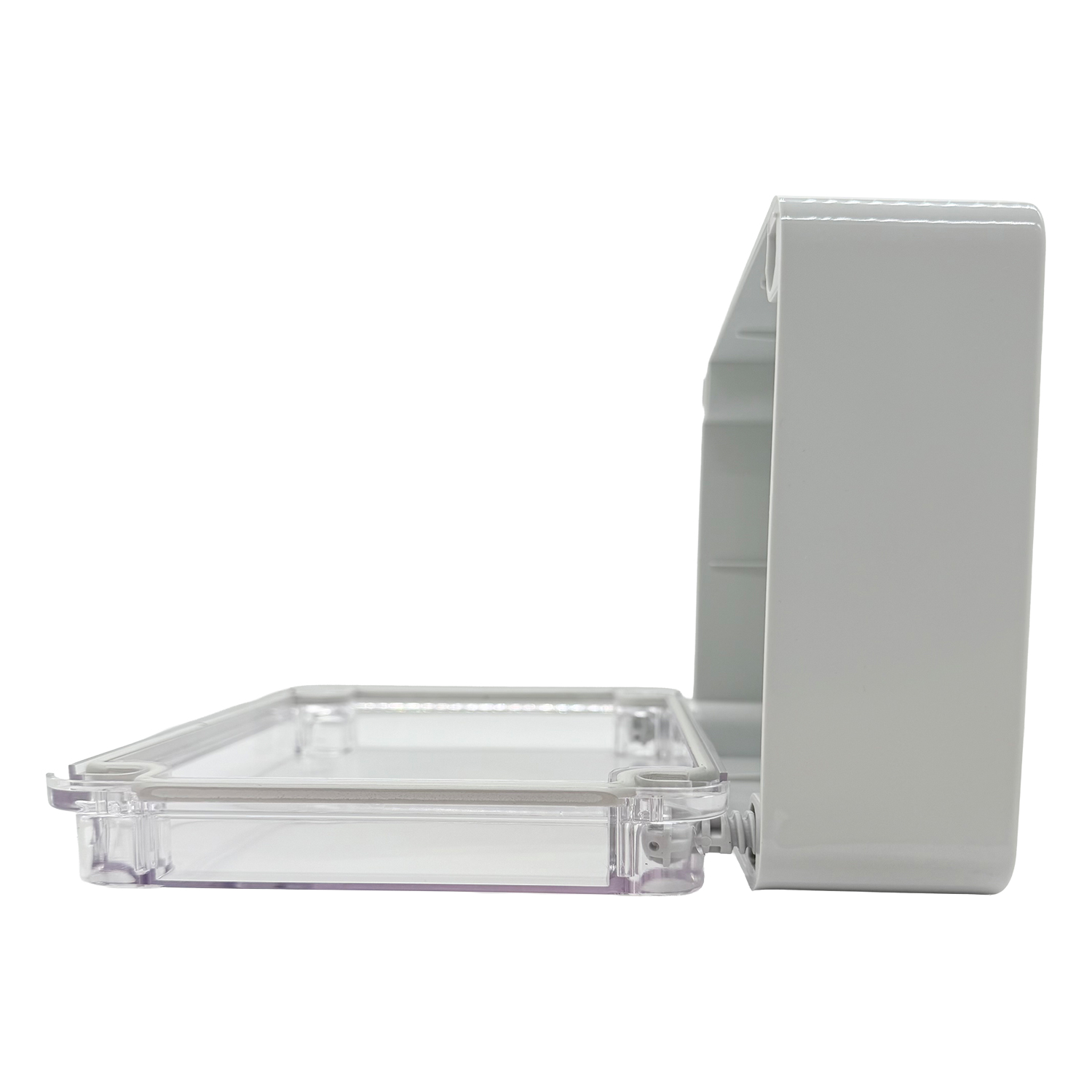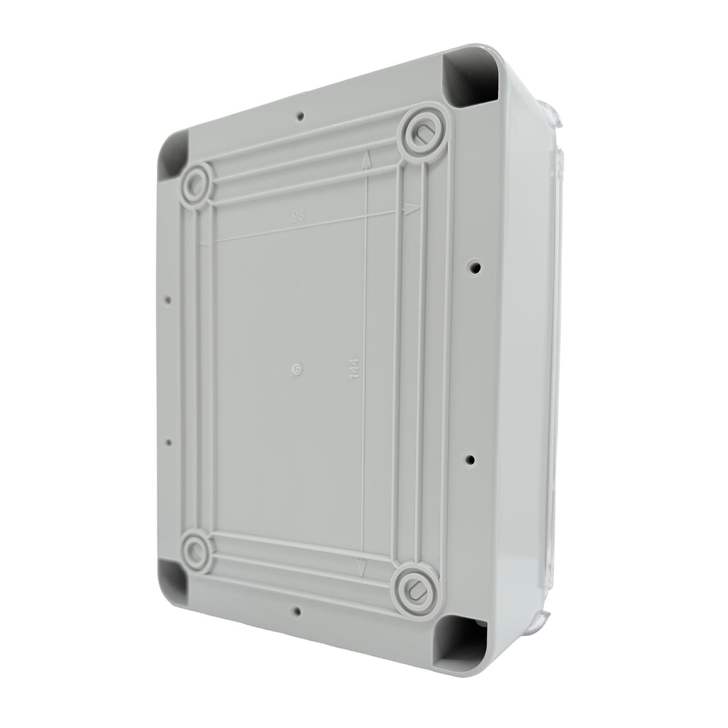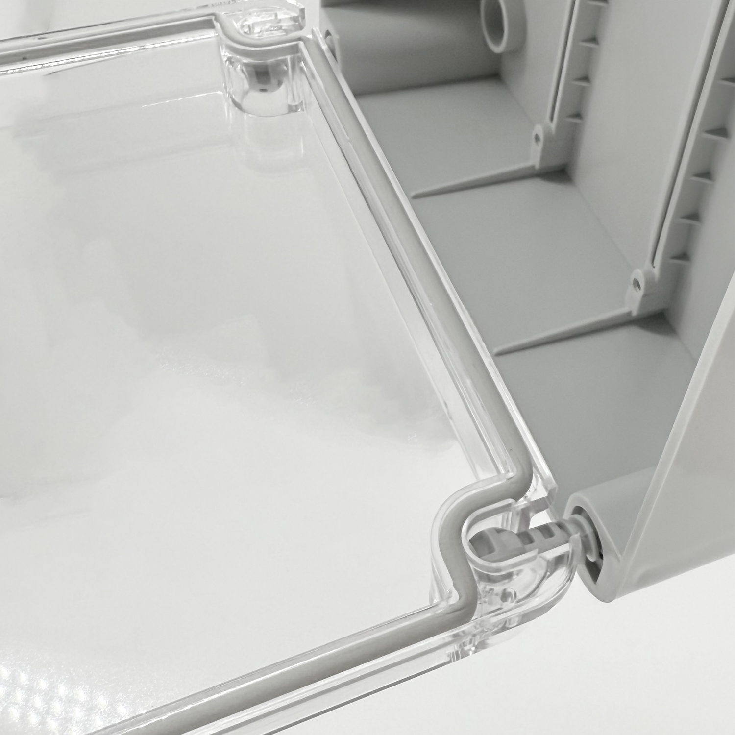 Für die Aufputzmontage konzipiert, ist das Gehäuse mit einer umlaufenden, integrierten Dichtung ausgestattet. Ein praktisches Detail: Der transparente Deckel kann während der Montage oder Wartung eingehängt werden, ohne vollständig entfernt werden zu müssen. Das erleichtert die Handhabung und spart Zeit – kein Ablegen des Deckels mehr notwendig.