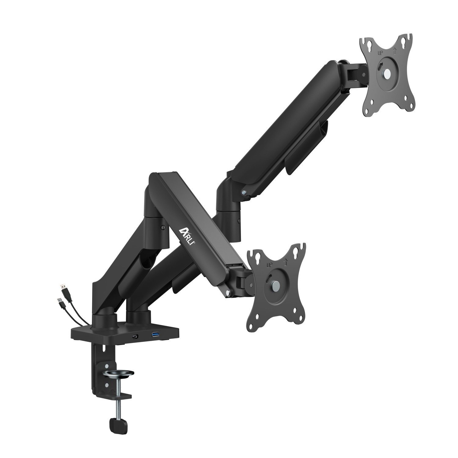 ARLI Gasdruckfeder Monitorhalterung Dual 17 – 32 Zoll mit USB-A & USB-C Höhenverstellbarer Monitorarm für 2 Monitore schwenkbar neigbar rotierbar Kabelmanagement