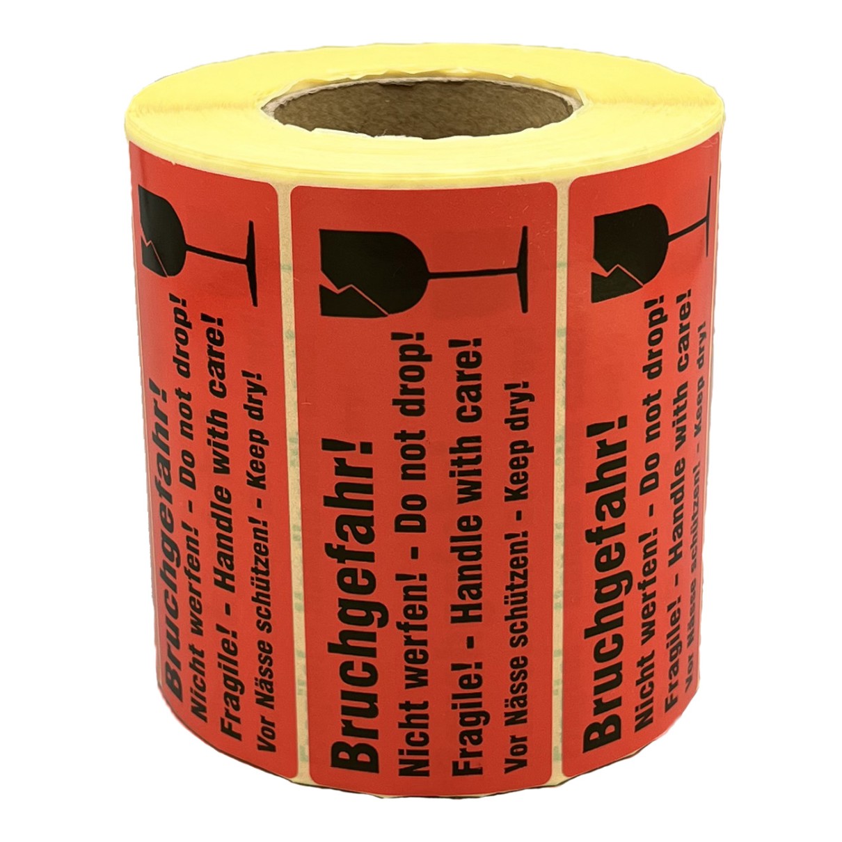 Das Kennzeichen dient zur Kennzeichnung und zum sicheren Transport von Gütern, die zerbrechlich sind und nicht mit Nässe in Kontakt kommen dürfen. Es weist darauf hin, dass der Karton weder geschüttelt noch zugeworfen werden darf. Der Aufkleber trägt den zweisprachigen Hinweis: „Bruchgefahr! Do not drop! Fragile! Handle with care! Vor Nässe schützen! Keep dry!“ – in schwarzem Druck auf rotem Hintergrund. Dieser Transportaufkleber kann ideal mit weiteren Warnetiketten aus unserem Sortiment kombiniert werden.