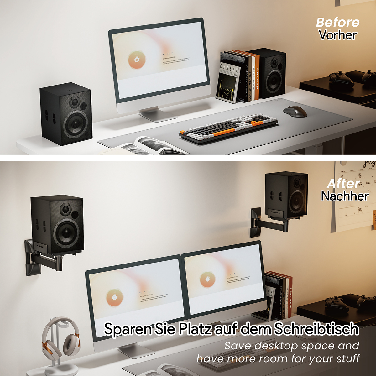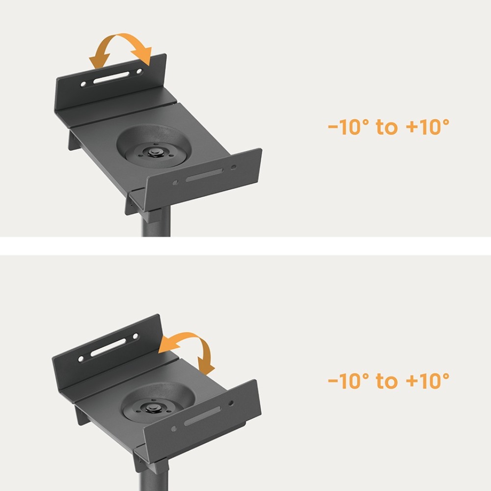 Dieses Lautsprecherhalterungs-Paar bietet eine flexible Anpassung und ist mit Lautsprechern verschiedener Marken kompatibel. Die ausziehbare Klemmstruktur der Trägerplattform mit rutschfesten Pads an den Seiten sorgt dafür, dass Lautsprecher in verschiedenen Größen sicher auf der Halterung sitzen. Die Plattform ist um 360° drehbar und kann horizontal sowie vertikal um 10° geneigt werden.
