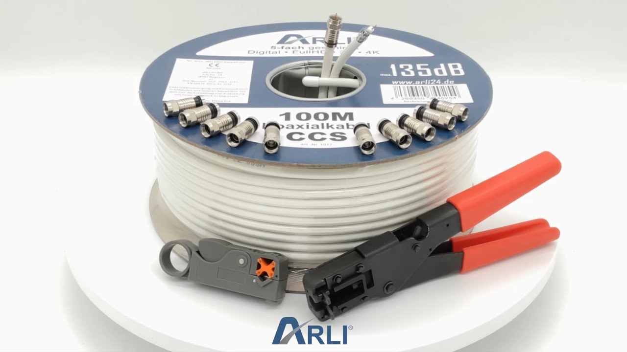 ARLI Set: 100m Koaxialkabel + Kompressionszange + Abisolierer + 20x F-Kompressionsstecker