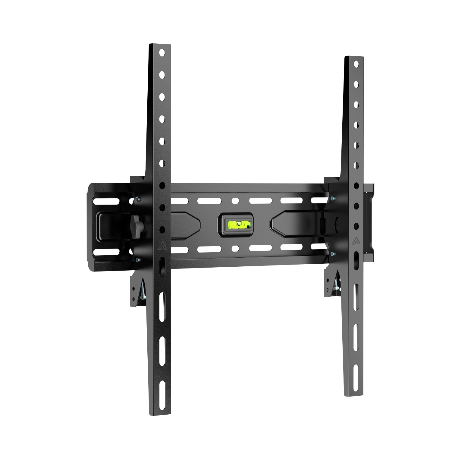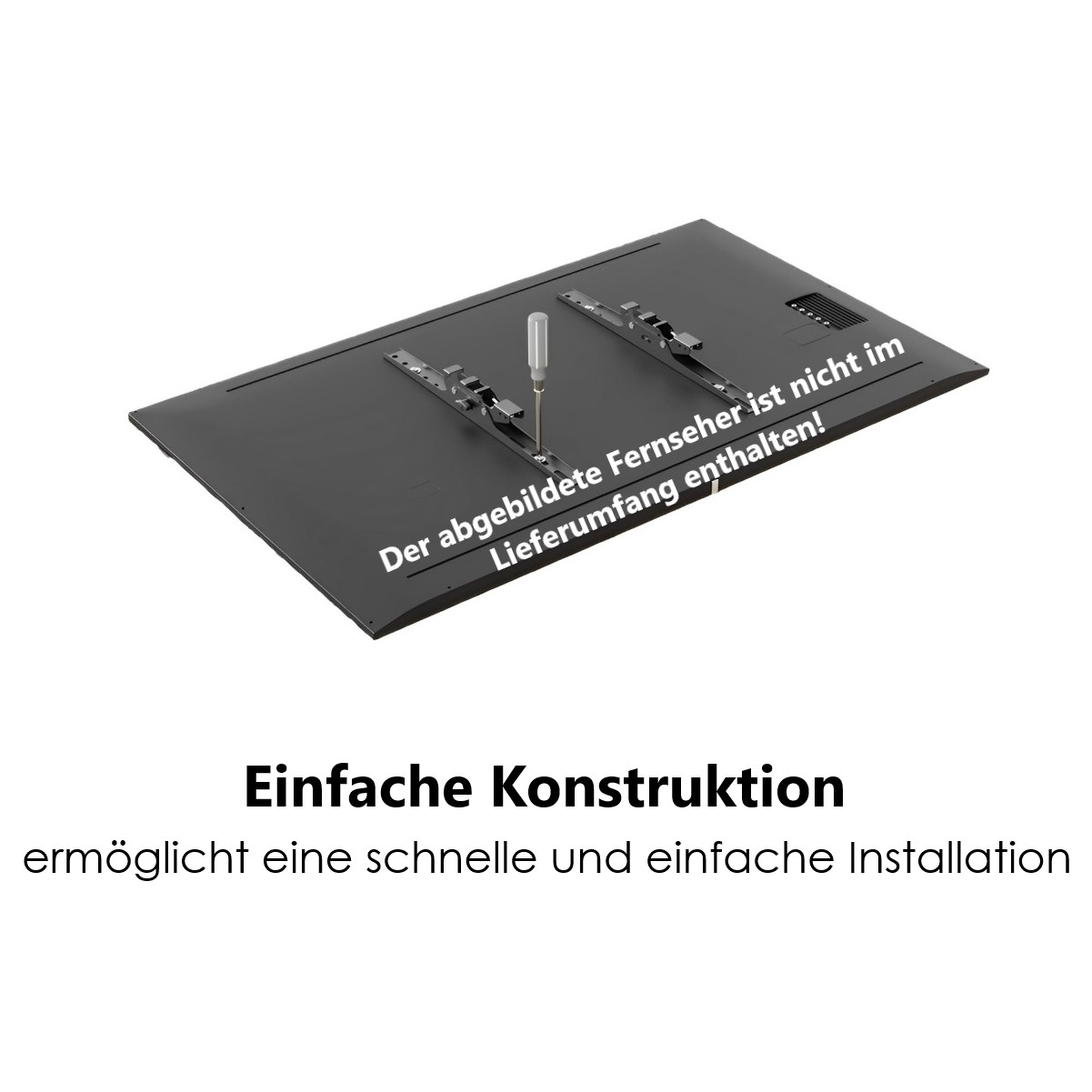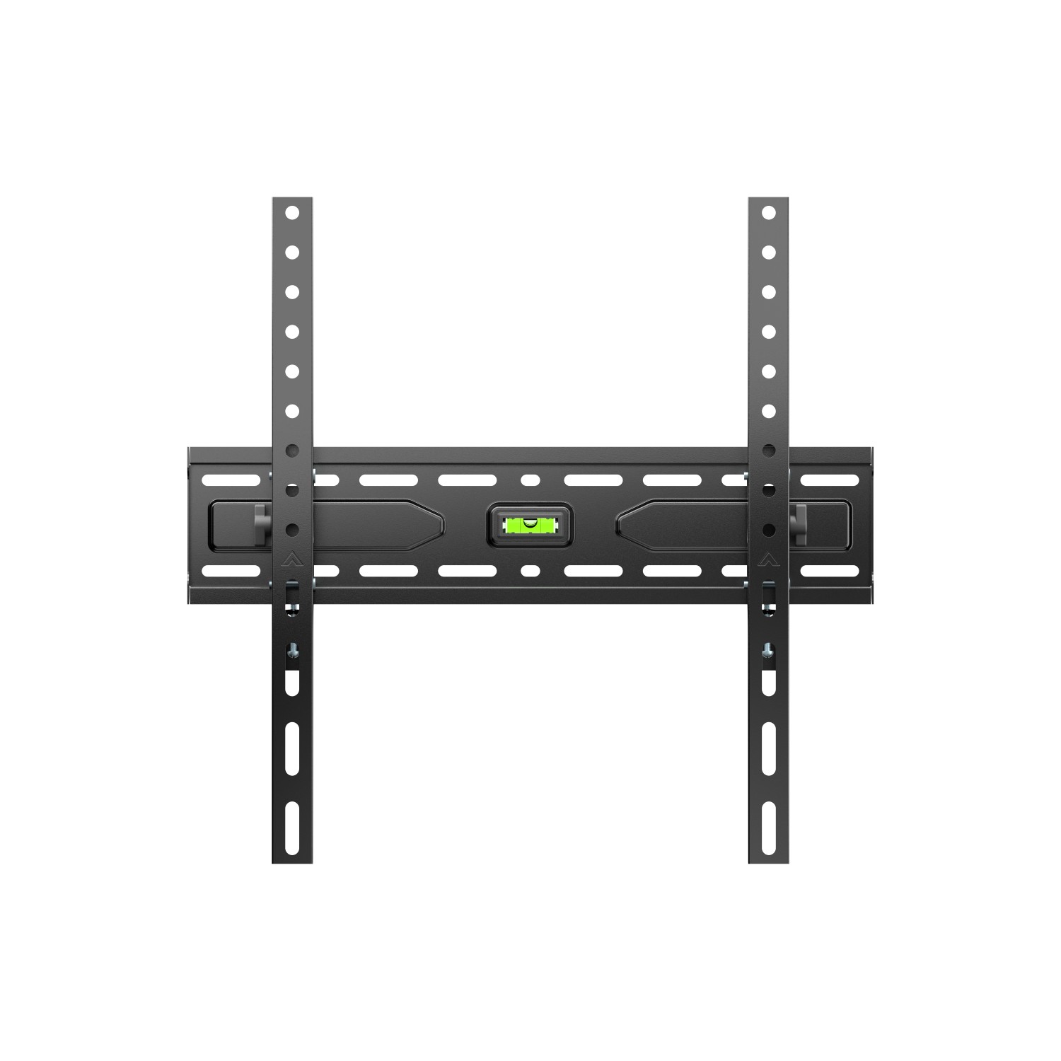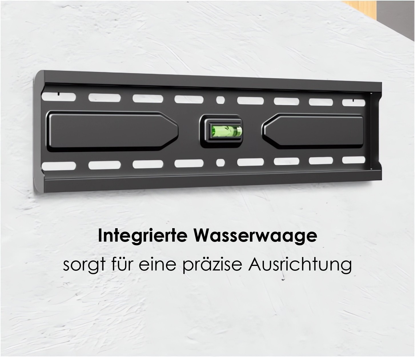 Eine integrierte Wasserwaage unterstützt bei der waagerechten Ausrichtung. Die Halterung ist für eine einfache Montage konzipiert und mit vielen TV-Größen kompatibel, geeignet für den Einsatz in Wohnräumen oder Büros.