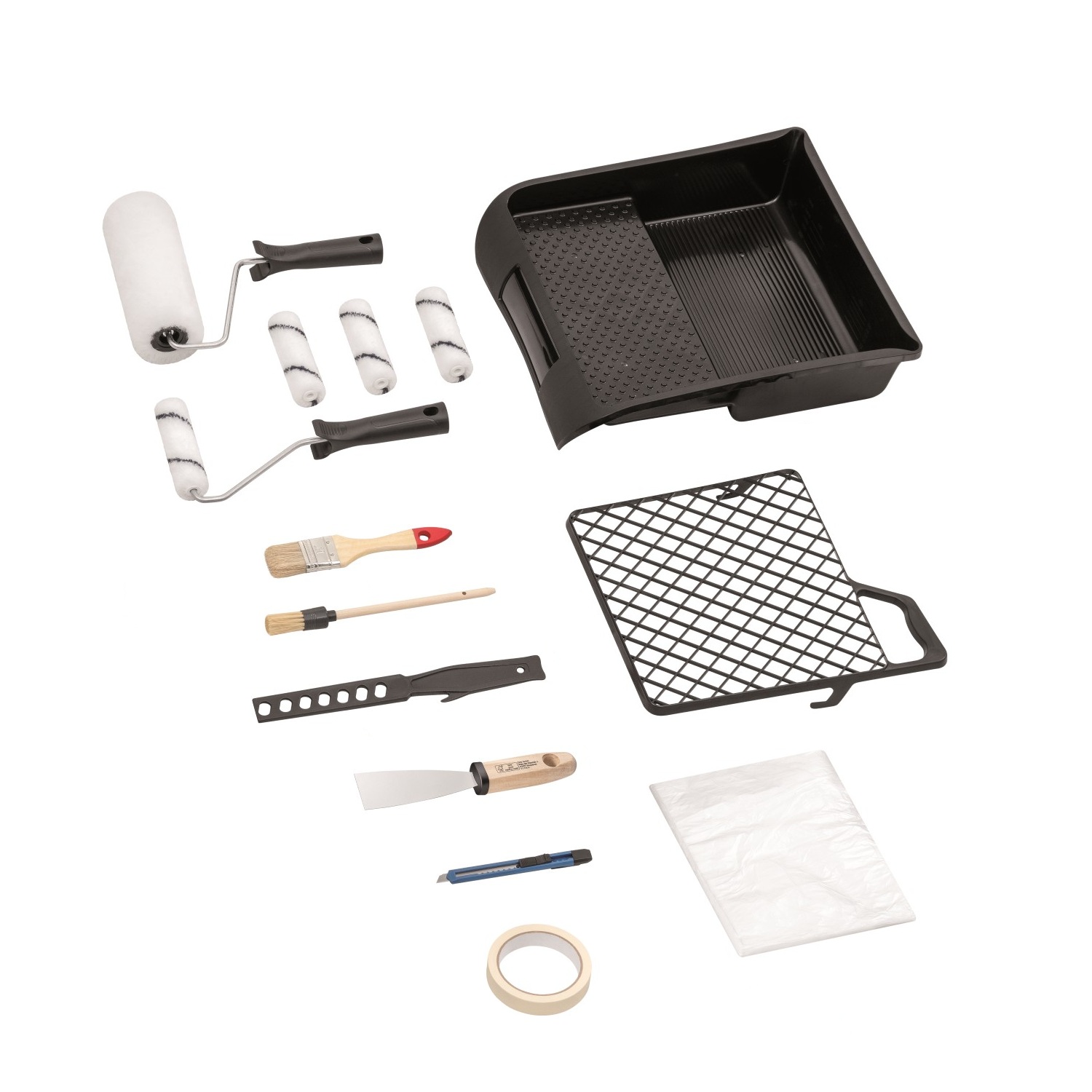 Praktisches und umfangreiches Set für Renovierungsarbeiten im Innenbereich. Es deckt alle Arbeitsschritte vom Abdecken und Abkleben bis zum Farbauftrag ab, ideal auch für größere Arbeitsumfänge geeignet.
