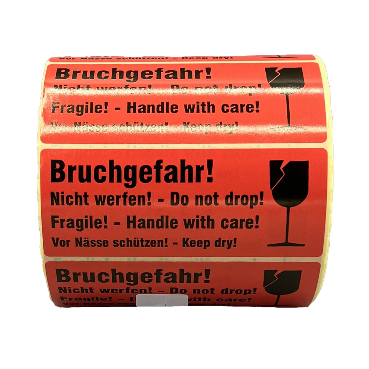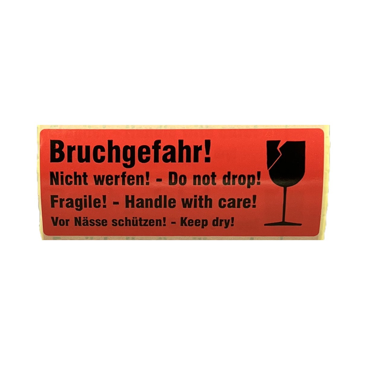 Das Kennzeichen dient zur Kennzeichnung und zum sicheren Transport von Gütern, die zerbrechlich sind und nicht mit Nässe in Kontakt kommen dürfen. Es weist darauf hin, dass der Karton weder geschüttelt noch zugeworfen werden darf. Der Aufkleber trägt den zweisprachigen Hinweis: „Bruchgefahr! Do not drop! Fragile! Handle with care! Vor Nässe schützen! Keep dry!“ – in schwarzem Druck auf rotem Hintergrund. Dieser Transportaufkleber kann ideal mit weiteren Warnetiketten aus unserem Sortiment kombiniert werden.